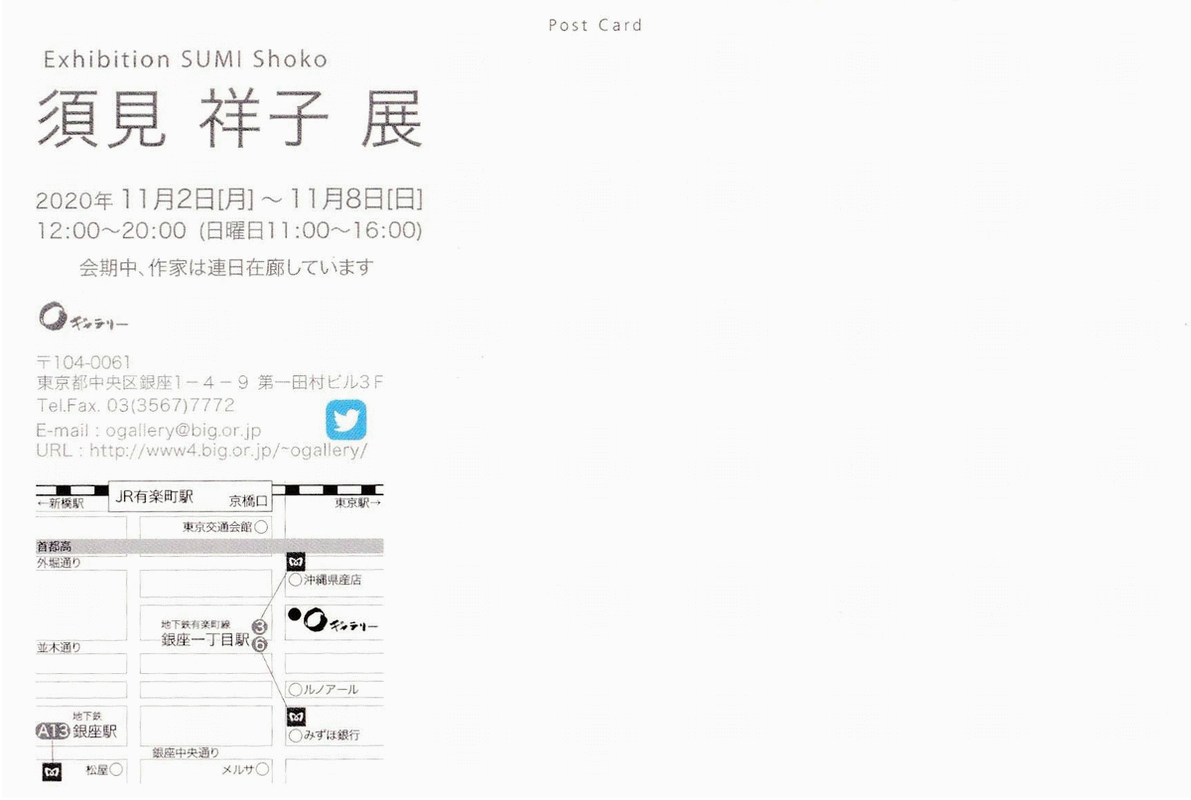2020年11月2日(月)~11月8日(日) OPEN 平日 12:00~20:00 日曜 11:00~16:00 会期中、作家は連日在廊しています。 Oギャラリー 〒104-0061東京都中央区銀座1-4-9 第一田村ビル 3F TEL/FAX 03(3567)7772 ogallery@big.or.jp http://www4.big.or.jp/~ogallery/ Tweet